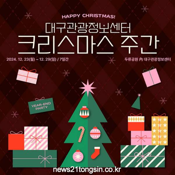 12월 23일(월)∼12월 29일(일) 7일간 대구관광정보센터에서는 연말을 맞아 다양한 크리스마스 관련 이벤트를 선보인다. 방문객들은 무료 상영회, 사랑의 느린 우체통, 체험 이벤트 등 다양한 프로그램에 참여하며 연말의 따뜻한 분위기를 만끽할 수 있다.