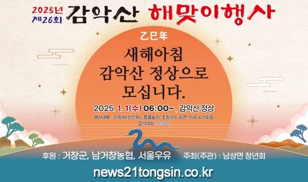 거창군은 을사년 새해 첫날 해발 952m 감악산 정상에서 제26회 감악산 해맞이 행사를 개최한다고 23일 밝혔다. 26번째를 맞는 이번 행사는 2025년 1월 1일 오전 6시부터 8시까지 진행되며 행사를 주관하는 남상면 청년회에서 다채로운 기념행사를 진행한다.
