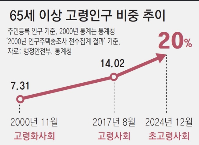올해 7월 노인 인구 1천만 명을 돌파한 데 이어 해가 바뀌기 전에 유엔 기준 초고령사회(노인 인구 비중 20%)에 도달한 것이다.