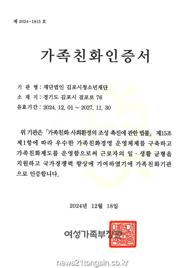 (재)김포시청소년재단은 2024년 12월 1일 여성가족부에서 주관하는 ‘가족친화인증기관’ 재인증 심사 평가에서 재인증을 승인받았다.