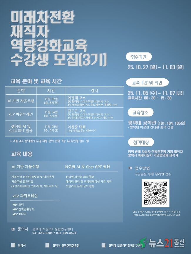 미래차 전환 인재 양성 3기 개설…AI와 xEV 중심 실무교육 강화평택대 교육 운영, 산업현장 적용 중심의 단기 모듈형 과정 진행 평택시(시장 정장선)와 평택산업진흥원은 자동차 산업 전후방 분야 재직자를 대상으로 하는 ‘미래차 전환 재직자 역량 강화 교육’ 3기 과정의 교육생 모집을 시작한다. 이번 교육은 11월 5일(수)...