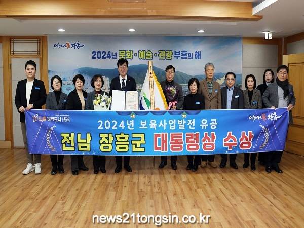 장흥군이 교육부 주관으로 실시한 ‘2024년 보육사업 발전 유공 정부 포상’에서 대통령 표창을 수상했다.교육부는 전국 229개 기초지자체, 공무원 및 개인을 대상으로 2024년 보육사업 발전 유공자를 발굴해 선정했다.장흥군은 보육환경 개선을 위한 다양한 시책 추진의 공로를 인정받아 대통령 표창을 수상하는 쾌거를 거두었다.이번 수상에서 대통령 표창을 받는 지자체는 전국에서 3곳으로, 전남에서는 장흥군이 유일하다.장흥군은 보육교사 처우개선을 위해 보육교사 수당 지원, 농어촌 소규모 어린이집 인건비 추가 지원, 민간 가정 어린이집 보육교사 인건비 지원, 조리원 인건비 추가 지원 등을 시행하고 있다.고향사랑기금을 활용하여 영유아들의 건강한 성장을 도모하기 위해 어린이집 이용 아동을 대상으로 찾아가는 언어치료 서비스를 지원하고 있다.또한 맞벌이 가정 등 양육공백이 발생한 가정에 아이돌봄서비스를 제공하며 본인부담금도 추가 지원하고 있으며, 어린이집 안전공제회 단체가입 및 어린이집 회계 컨설팅 지원 등 어린이집의 경제적 부담을 낮추고 질 높은 보육환경 조성을 위해 다양한 우수 시책을 추진하고 있다.김성 장흥군수는 “대통령 표창으로 장흥군의 선진적인 보육정책이 대외적으로 인정받게 돼 매우 기쁘다”라며 “앞으로도 영유아와 부모, 보육교직원 모두가 행복한 장흥군이 될 수 있도록 다양한 정책을 적극 추진하겠다”라고 밝혔다.