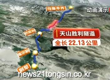 터널 관통으로 톈산을 넘는 데 걸리는 시간이 기존 3시간에서 20분으로 단축된다.