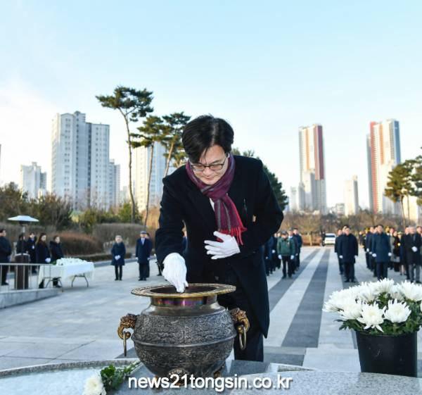 김포시(시장 김병수)가 2일 오전 9시 마산동 소재 현충탑에서 을사년(乙巳年) 새해맞이 참배로 2025년 첫 공식 일정을 시작했다. 이날 참배에서는 김병수 김포시장, 김종혁 김포시의회 의장, 김주영 국회의원을 비롯한 도의원, 시의원, 유관기관·단체장 및 김포시 간부공무원 등 100여명이 함께 참석해 순국선열과 호국영령의 넋을 기렸다. 특히 ‘제주항공 참사’ 희생자에 추모와 애도의 마음을 함께 전하며 경건한 분위기 속에서 진행됐다. 김병수 김포시장은 헌화와 분향을 마치고, “2025년 을사년 청사의 해를 맞아 시민의 안전과 행복에 귀 기울이는 정책을 추진해 김포시민 일상의 편의 확장과 미래성장동력 구축에 힘쓰겠다”고 말했다. | ||||