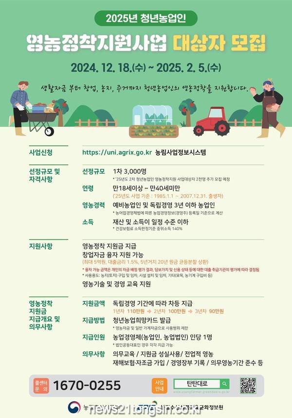 (뉴스21통신) 홍미희기자 = ‘후계 농업 경영인 육성 사업’은 농업 발전을 이끌어나갈 유망한 예비 농업인 및 농업 경영 인을 발굴하여 일정 기간 자금·교육·컨설팅 등을 종합적으로 지원함으로써 정예 농업 인력으로 육성하기 위한 사업이다.