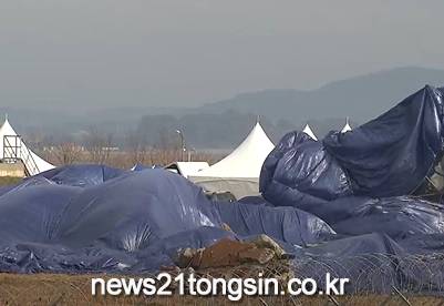 무안국제공항에 하루종일 비가 오락가락 하면서 현장 보존을 위해 사고 현장 일대에 방수포가 설치됐다.
