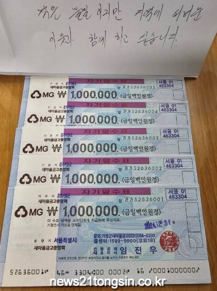 기부자가 전달한 봉투에는 “작은 물질이지만 지역의 어려운 이웃분들과 함께하고 싶습니다”라는 따뜻한 메시지가 담긴 편지와 함께 100만 원권 수표 5장이 들어 있었다.