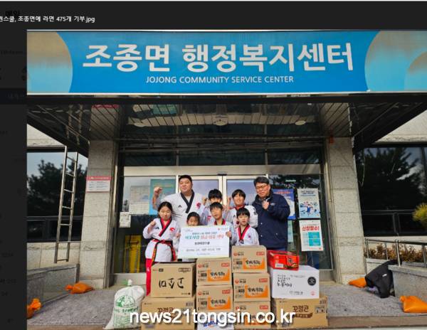 가평군 조종면에 있는 동원태권스쿨은 최근 조종면행정복지센터를 방문해 라면 475개 등을 기탁하며 이웃사랑을 실천했다.