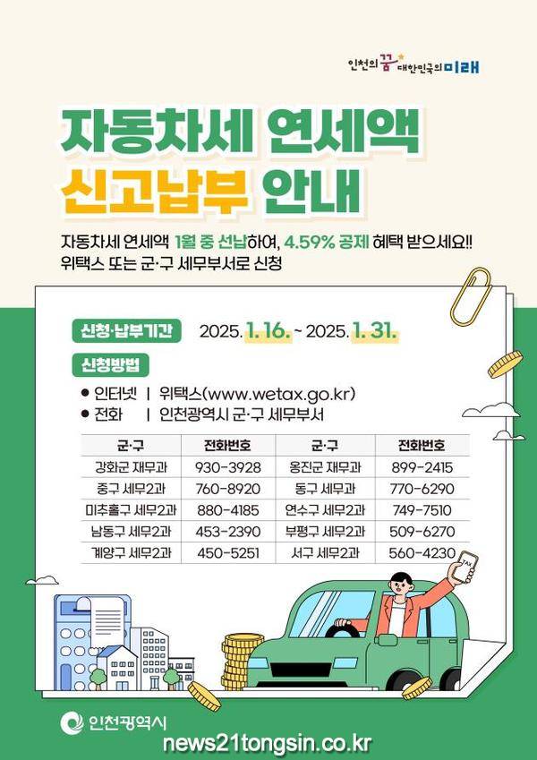 인천광역시(시장 유정복)는 이달 31일까지 자동차세 연세액 납부 신청을 받는다고 밝혔다.