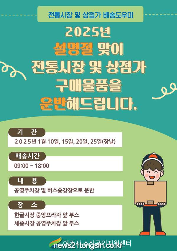 여주시 소상공인지원센터(유준희 센터장)는 “설 명절을 맞아 많은 시민들이 전통시장을 편리하게 이용하실 수 있도록 하고, 지역 경제 활성화와 전통시장 소상공인 지원을 위해 배송서비스를 마련했다.”며, “앞으로도 전통시장 활성화를 위해 다양한 지원책을 추진할 계획”이라고 전했다.