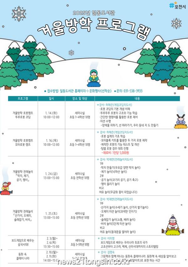 프로그램에 대한 자세한 문의와 접수는 포천시 일동도서관 누리집(https://lib.pocheon.go.kr/ildong) 또는 포천시 일동도서관(☎031-538-3933)으로 가능하다.