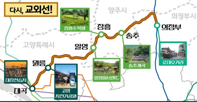 교외선은 대곡역, 원릉역, 일영역, 장흥역, 송추역, 의정부역 등 6개 역에 정차한다. 무궁화호 열차 3대가 하루 8차례 왕복 운행한다. 대곡역에서 의정부역까지 50분가량 소요된다. 기본요금은 2600원이며, 대곡역에서 GTX-A 노선으로 환승할 수 있다. 이달 31일까지는 전 구간 운임 1000원 행사를 진행한다.