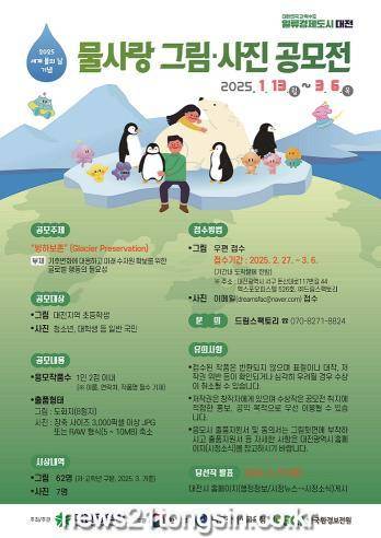 대전시는 3월 22일 세계 물의 날을 맞아 유엔(UN)이 정한 2025 세계 물 환경 주제인‘빙하보존’을 내용으로 1월 13일부터 3월 6일까지‘물사랑 그림 ․ 사진 공모전’을 개최한다.