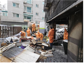 올해 첫눈이 내렸던 지난 11월 27일에는 성내2동주민센터 직원들이 강동소방서, 의용소방대, 구청 청소행정과, 입주민 등 총 50여 명과 함께 1차 대청소를 진행했다. 이 과정에서 성내2동주민센터 직원이 이재민이 분실한 현금 뭉치(500여만 원)를 화재 잿더미 속에서 찾아내어 주인에게 돌려준 일도 있었다. 이어서 12월 6일에는 성내동 권역의 3개 주민센터와 직능단체원, 해병대전우회 등이 이재민들과 함께 화재 현장의 폐기물 처리 작업을 진행하기도 했다.