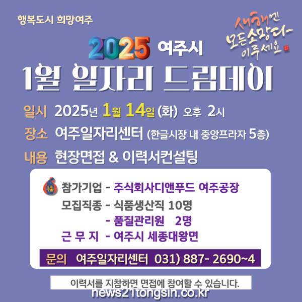여주시(시장 이충우)는 오는 1월 14일 화요일 오후 2시, 여주일자리센터(세종로 14번길 18, 중앙프라자 5층)에서 2025년 첫 번째 일자리드림데이를 개최한다. 이번 행사는 주식회사 디앤푸드 여주공장과 협력해 지역 내 일자리를 발굴하고 구직자에게 현장면접 기회를 제공하기 위해 마련됐다.