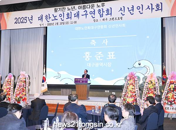 홍준표 대구광역시장은 1월 10일(금) 대구그랜드호텔 다이너스티홀 B홀에서 열린 2025년 대한노인회 대구광역시연합회 신년인사회(주최/주관: 대한노인회 대구광역시연합회)에 참석해 2025년 을사년(乙巳年) 새해를 맞아 어르신들께 신년 인사를 드리고 행사 축하 인사를 전했다.