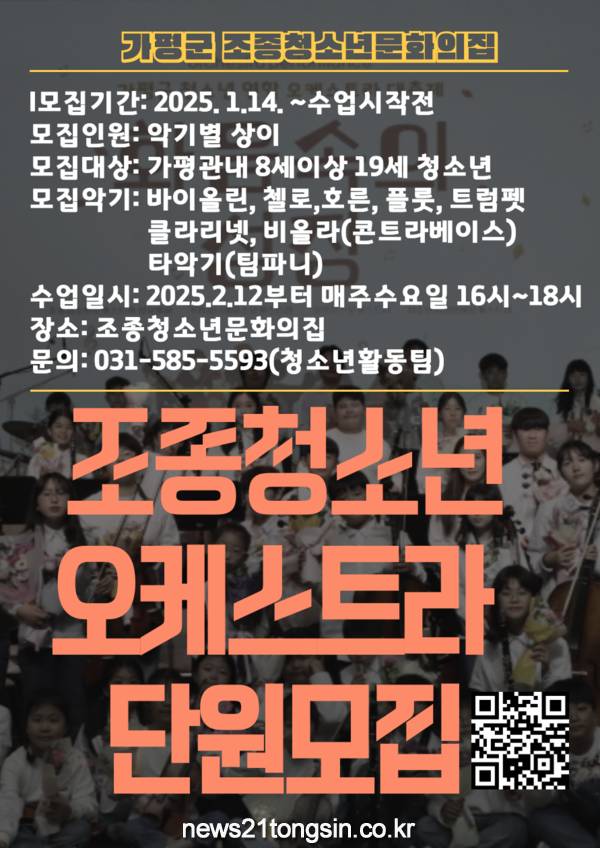 조종청소년오케스트라는 2024년 한 해 동안 버스킹 공연과 가평군 청소년시설 연합 오케스트라 대축제에 참여하며 뛰어난 연주 실력을 선보였다. 2025년에도 기존 단원과 함께할 새로운 신입 단원을 모집해 청소년 문화 활성화를 이어갈 계획이다.