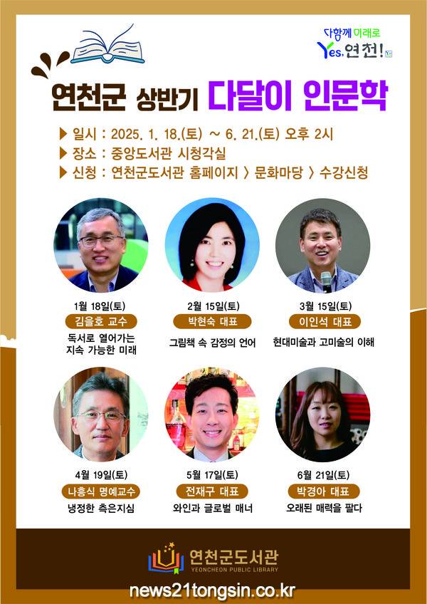 연천군은 1월부터 매월 셋째주 토요일 연천군 독서홍보대사 김을호 교수와 함께하는 ‘다달이 인문학’을 운영한다. ‘다달이 인문학’ 프로그램은 성인을 대상으로 철학, 건강, 언어, 문화, 예술, 식문화 등 다양하고 흥미로운 주제를 통해 인문학적 소양을 함양할 수 있는 기회를 제공할 것이다.