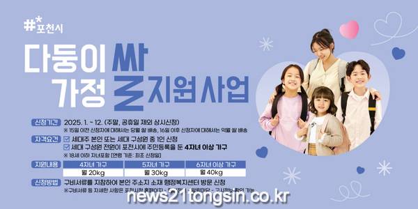 대상은 포천시에 거주하며 막내 자녀가 18세 이하인 4자녀 이상 가구로, 4자녀 가구는 20kg, 5자녀 가구는 30kg, 6자녀 이상 가구는 40kg의 포천 쌀이 지원된다.