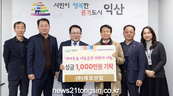익산시는 ㈜데코산업(대표 이관영)이 시청을 방문해 이웃돕기 성금 1,000만 원을 기탁했다고 14일 밝혔다.