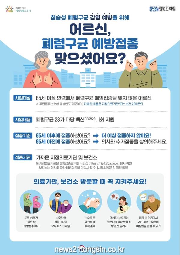 접종 대상은 주민등록상 1960년 1월 1일부터 12월 31일 출생자(만 65세)이며 폐렴구균을 한 번도 접종하지 않은 만 65세 이상 어르신도 접종 가능하다.