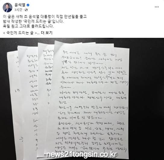 윤 대통령의 계정에는 육필 원고 사진과 함께 윤 대통령이 약 9천자 분량의 이 글을 올해 초 직접 작성했다는 설명이 게재됐다.