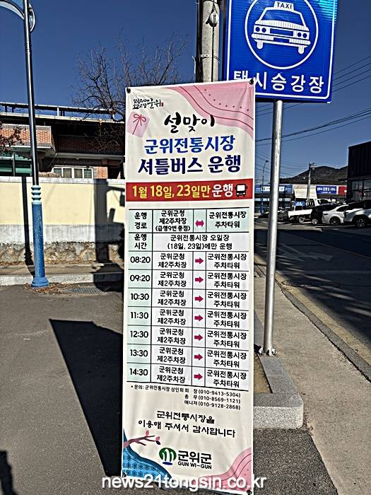 군위군과 군위전통시장 상인회에서는 설을 맞아 군위전통시장을 방문하는 이용객들의 편의를 위해 군위전통시장 오일장이 열리는 1월 18일(토), 1월 23일(목)에 셔틀버스를 운행할 예정이다.