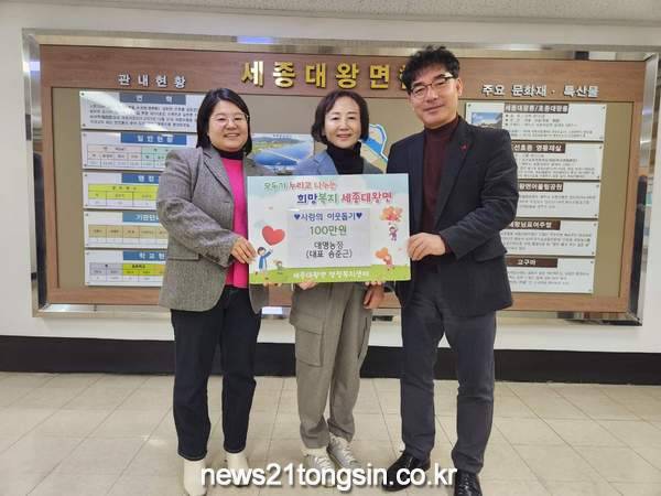 홍광래 세종대왕면장은 “수년 동안 어려운 이웃을 위해 희망과 사랑으로 나눔운동에 앞장서 주시는 마음 감사드린다.”며 “기탁해 주신 성금은 복지 지원이 필요한 위기가구를 위해 소중하게 사용하겠다.”고 전했다.