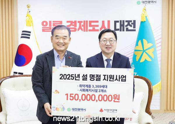 대전사회복지공동모금회 유재욱 회장은 16일 이장우 대전시장을 만나 지역의 어려운 이웃이 따뜻한 설 명절을 나는 데 써 달라며 1억 5천만 원을 기탁했다.