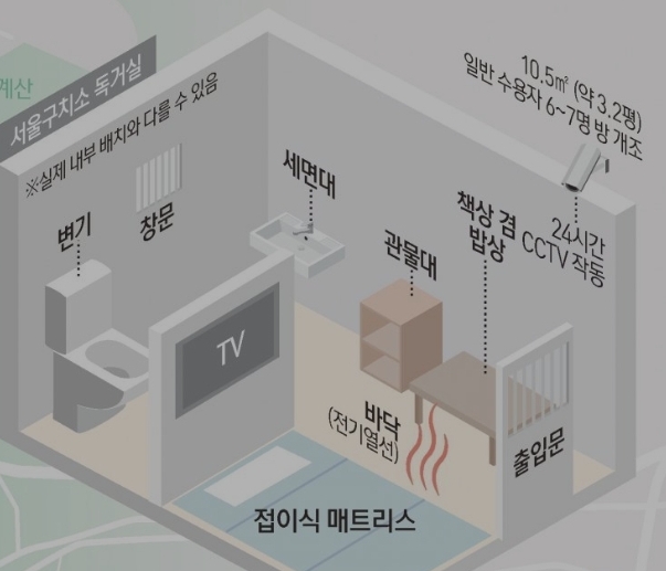 법무부 관계자는 “(독방의 크기는) 기본적으로 일반 수용자가 사용하는 독방의 형태” 라며 “크기는 1~3평 등 다양하다”고 밝혔다.
