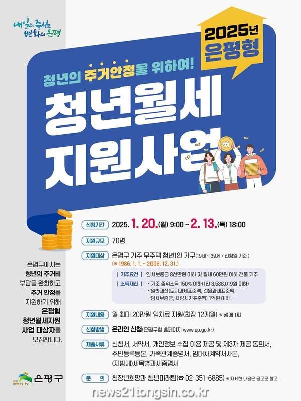 은평구(구청장 김미경)는 서울시 자치구 최초로 시행 중인 ‘은평형 청년월세지원 사업’을 월 최대 20만 원 최장 12개월로 최대 240만 원 지원한다고 밝혔다.