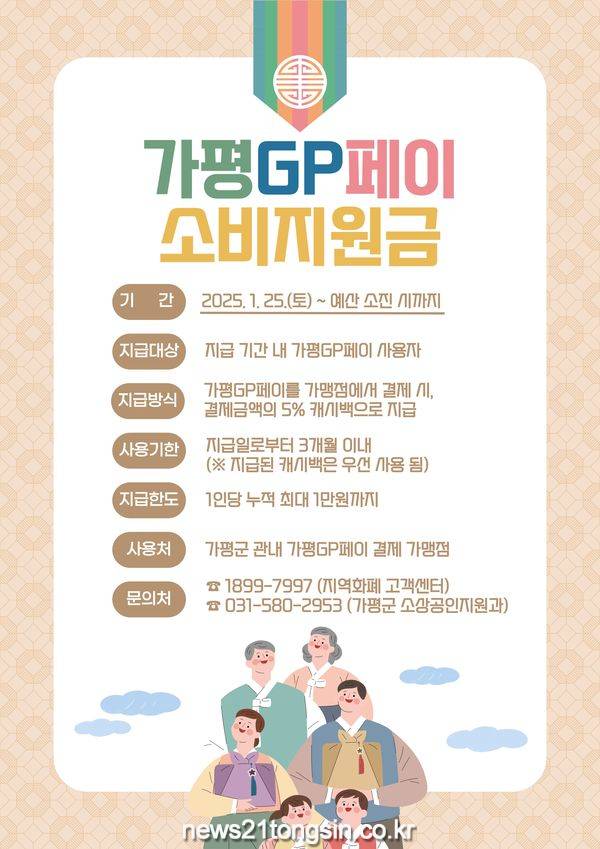 ▲ 사진=가평군가평군(군수 서태원)은 설 명절을 맞아 오는 1월 25일부터 지역화폐인 가평GP페이 소비지원금을 지급한다고 밝혔다. 지역경제 활성화를 위한 설맞이 소비지원금 이벤트는 관련 예산 소진시까지 진행된다.