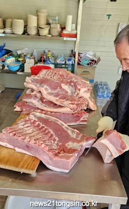 ▲ 사진=연천군대광1리노인회(회장 이남수)는 대광1리마을회관에서 돼지고기 4마리를 노인회 130여명 회원들에게 2kg씩 소포장하여 나눔 행사를 진행했다고 17일 밝혔다.
