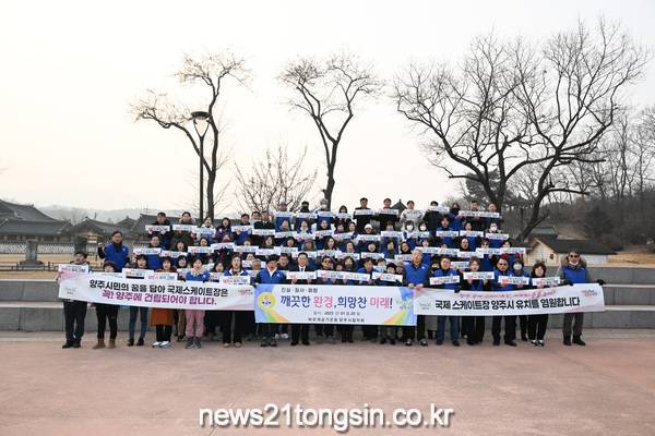 ▲ 사진=양주시양주시(시장 강수현)가 지난 20일 양주관아지 일대에서 바르게살기운동 양주시협의회(회장 송인만) 회원 100여 명이 참여한 가운데 ‘설 명절 맞이 환경캠페인’ 및 ‘국제스케이트장 유치 기원’ 행사를 진행했다고 밝혔다.