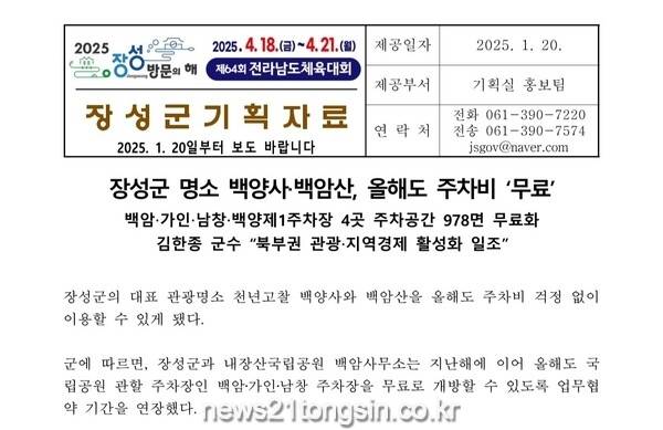 장성군이 20일부터 언론‧방송사에 전송하는 보도자료 서식을 변경해 제64회 전라남도체육대회와 ‘2025년 장성 방문의 해’ 홍보를 시작했다고 밝혔다.