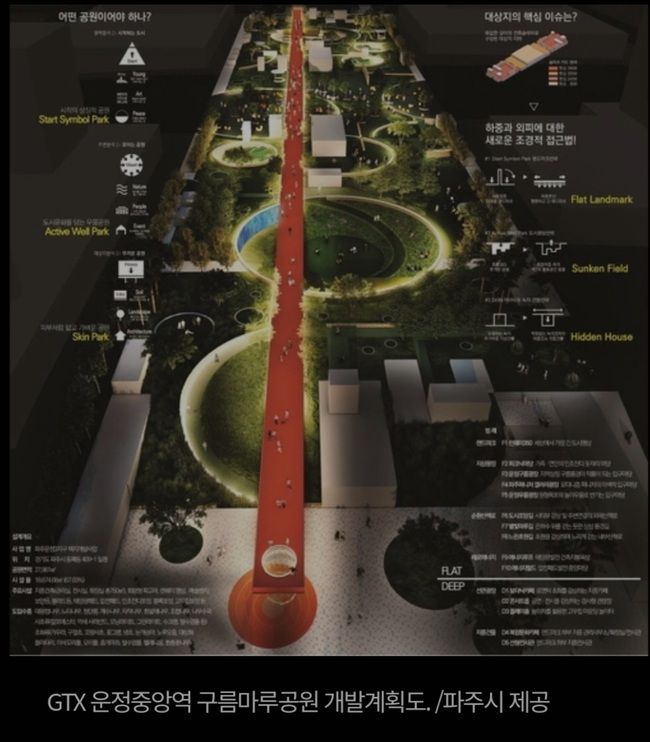 지난 21일 파주시에 따르면 시는 지난해 말 개통된 GTX-A노선 운정중앙역을 ‘수도권 서북부 랜드마크’로 조성하기 위한 개발사업을 추진하고 있다. 시는 이를 위해 지난해 9월 말 한국토지주택공사(LH)와 공동으로 파주 운정3지구 GTX 문화공원(구름마루) 설계공모 당선작 설명회에 이어 현재 실시설계 작업을 진행하고 있다.