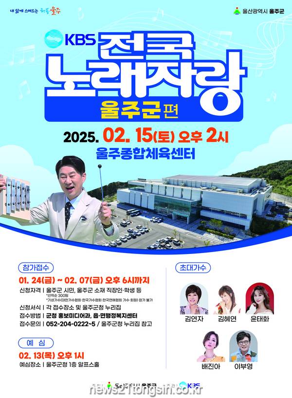 (뉴스21통신/우정석기자) = 울산시 울주군이 다음달 15일 삼남읍 울주종합체육센터에서 6년 만에 ‘KBS전국노래자랑’을 개최한다고 23일 밝혔다.