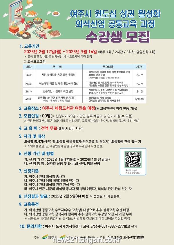이번 교육의 접수기간은 1월 17일(금)부터 1월 31일(금)까지, 신청자격은 외식업 종사자(상인) 및 외식산업 예비창업자, 외식업에 관심있는 지역주민 대상으로 여주시뿐만 아니라 인근 시·군에서도 참여가 가능하다. 신청방법은 여주시청 홈페이지에서 신청서를 내려받아 이메일(zeners21@korea.kr)로 신청하거나 여주시 도시재생지원센터로 방문 접수, 또는 온라인 접수 등으로 신청하면 된다.