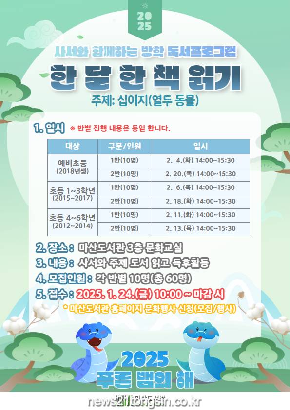 ‘한 달 한 책 읽기’는 담당 사서의 주도로 진행되는 독서프로그램으로 ‘십이지’와 ‘올해의 동물’을 주제로 사서와 함께 책을 읽고 관련 독후 활동을 진행하는 프로그램이다. 대상은 2025학년도 예비 초등 1학년생인 2018년생 어린이부터 2024학년 기준 초등 6학년생까지로 ▲예비 초등, ▲초등 1~3학년, ▲초등 4~6학년의 세 그룹으로 나누어 진행할 예정이다. 그룹별로 2개의 반으로 구성되며 일정은 마산도서관 홈페이지 공지사항 등을 통해 꼭 확인이 필요하다.