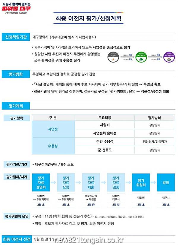 작년 한 해 동안 국방부는 현지 실사를 포함한 예비후보지 평가를 실시했으며, 올해 1월 20일(월) ‘대구 군부대 이전 예비후보지 선정 심의위원회’를 거쳐 1월 21일(화) 대구시로 예비후보지 선정 결과를 통보했다.