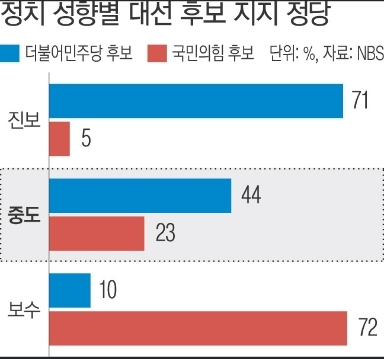 엠브레인퍼블릭, 케이스탯리서치, 코리아리서치, 한국리서치가 지난 20~22일 성인 1000명을 대상으로 진행한 전국지표조사(NBS·응답률 22.2%)에서도 중도라고 응답한 304명 중에서는 국민의힘이 24%, 민주당이 41%였다.