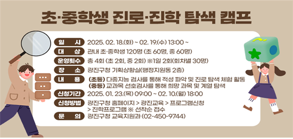 ▲ 사진=광진구광진구(구청장 김경호)가 초‧중학생들을 대상으로 ‘진로‧진학 탐색 캠프’를 운영, 참여자를 모집한다.