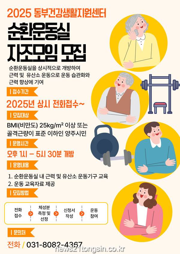 ▲ 사진=양주시 양주시 동부건강생활지원센터는 시민을 대상으로 순환 운동기구를 활용한 근력운동 프로그램 추진을 위해 ‘순환운동실 자조모임’ 참여자를 모집한다고 24일 밝혔다.