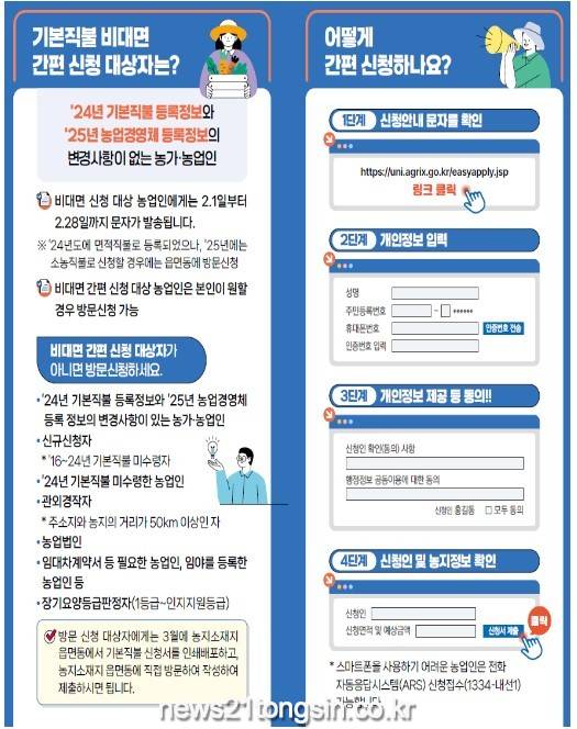 방문신청 대상자는 ▲신규신청자 ▲변동사항이 있는 기존신청 농업인 ▲농업 법인 ▲비대면미신청 농업인 등으로, 3월 4일부터 4월 30일까지 경작 면적 가장 넓은 읍·면 행정복지센터 산업팀을 방문해 신청하면 된다.