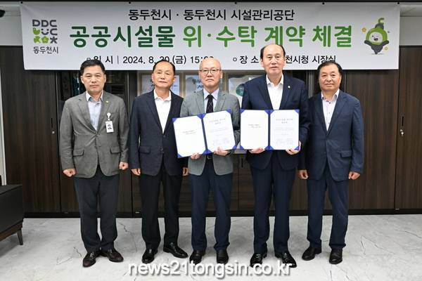 ▲ 사진=동두천시동두천시(시장 박형덕)는 지난달 30일, 시장실에서 박형덕 동두천시장과 이종진 동두천시 시설관리공단 이사장 등 5명이 참석한 가운데 공공시설물 위수탁 계약 체결식을 개최했다.