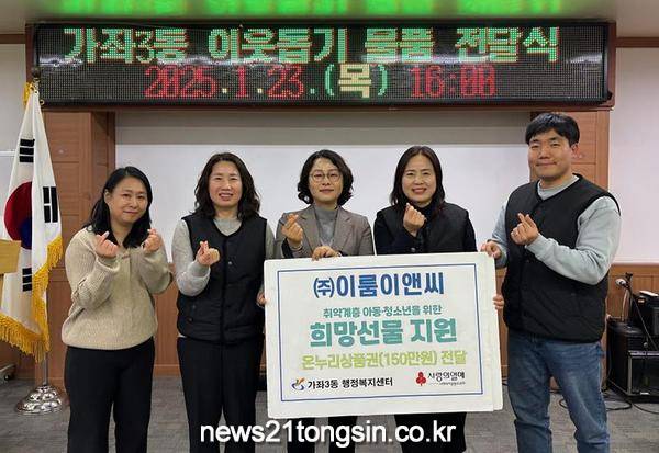 인천 서구 가좌3동은 지역사회보장협의체(공동위원장 김성주, 이춘자)는 지난 23일 ㈜이룸이앤씨(대표 손연희)로부터 관내 취약계층 아동·청소년을 위한 ‘희망 선물’ 온누리 상품권 150만원을 전달받았다.