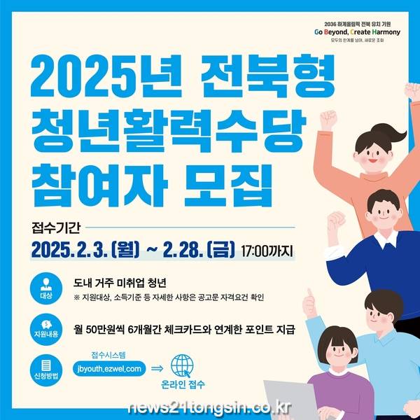 전북특별자치도 정읍시가 미취업 청년의 구직활동을 지원하기 위해 전북형 청년활력수당 지원사업 참여자를 2월 3일부터 28일까지 모집한다고 밝혔다.
