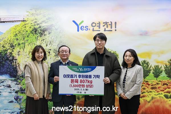 ▲ 사진=연천군전곡읍 소재 ㈜숭실(대표 김명규)은 3일 지역 내 어려운 이웃을 위해 돈육 807kg(1,500만원 상당)을 연천군에 기탁했다.