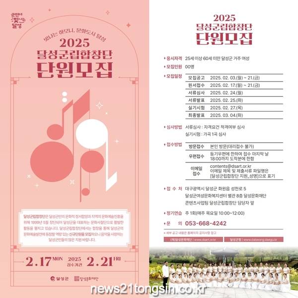 (뉴스21통신/홍미희기자) = 오는 17일부터 4일간 (재)달성문화재단(이사장 최재훈)에서는 달성군을 대표하는 문화예술단체인 달성군립합창단과 함께할 역량 있는 신규 단원을 모집한다.