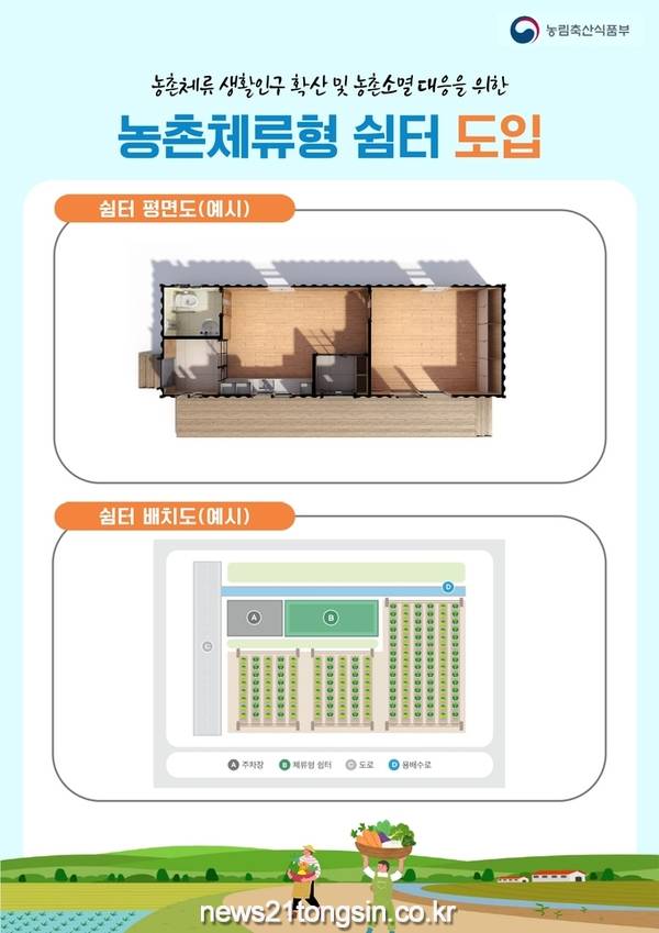 농촌 체류형 쉼터는 연면적 33㎡ 이하의 가설 건축물 형태로 설치되며, 농지에 농지전용 허가 없이도 설치가 가능하다. 이는 기존의 농막보다 쾌적한 환경을 제공해, 일시적인 숙박과 체류가 가능한 공간으로 활용된다. 쉼터에는 처마, 데크, 주차장, 오수처리시설 등 부속시설도 일정 면적까지 연면적 산정에 포함되지 않아, 더욱 다양한 활용이 가능하다.